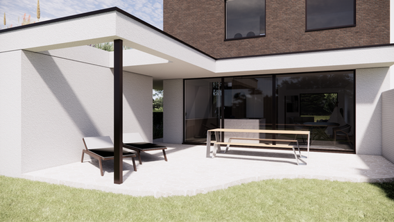 Eetruimte en keuken worden aan de tuin verbonden via een overdekte luifel die het verlengde is van de het dak van de tuinberging. Op die manier is er meteen een oplossing aangeboden voor het direct invallend zonlicht in de warme zomermaanden zonder de daglichttoetreding te beperken.